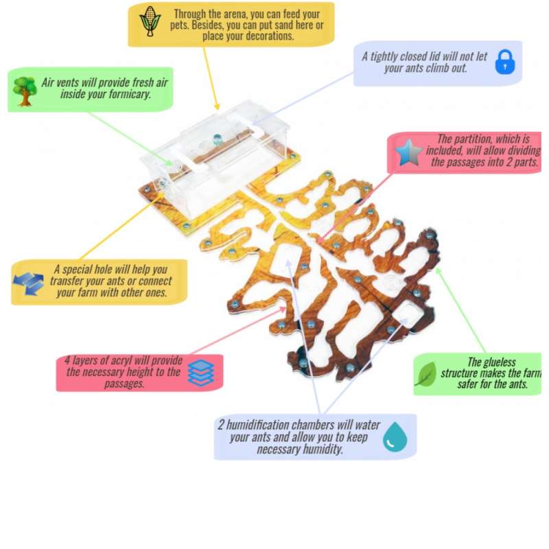 Шукаєте якісну та доступну мурашину ферму? "Осіннє дерево" – це чудовий варіант для середніх колоній, що дозволяє спостерігати за життям мурах у природних умовах. Формікарій виконаний у стильному дизайні та оснащений усім необхідним для догляду за вашими підопічними.